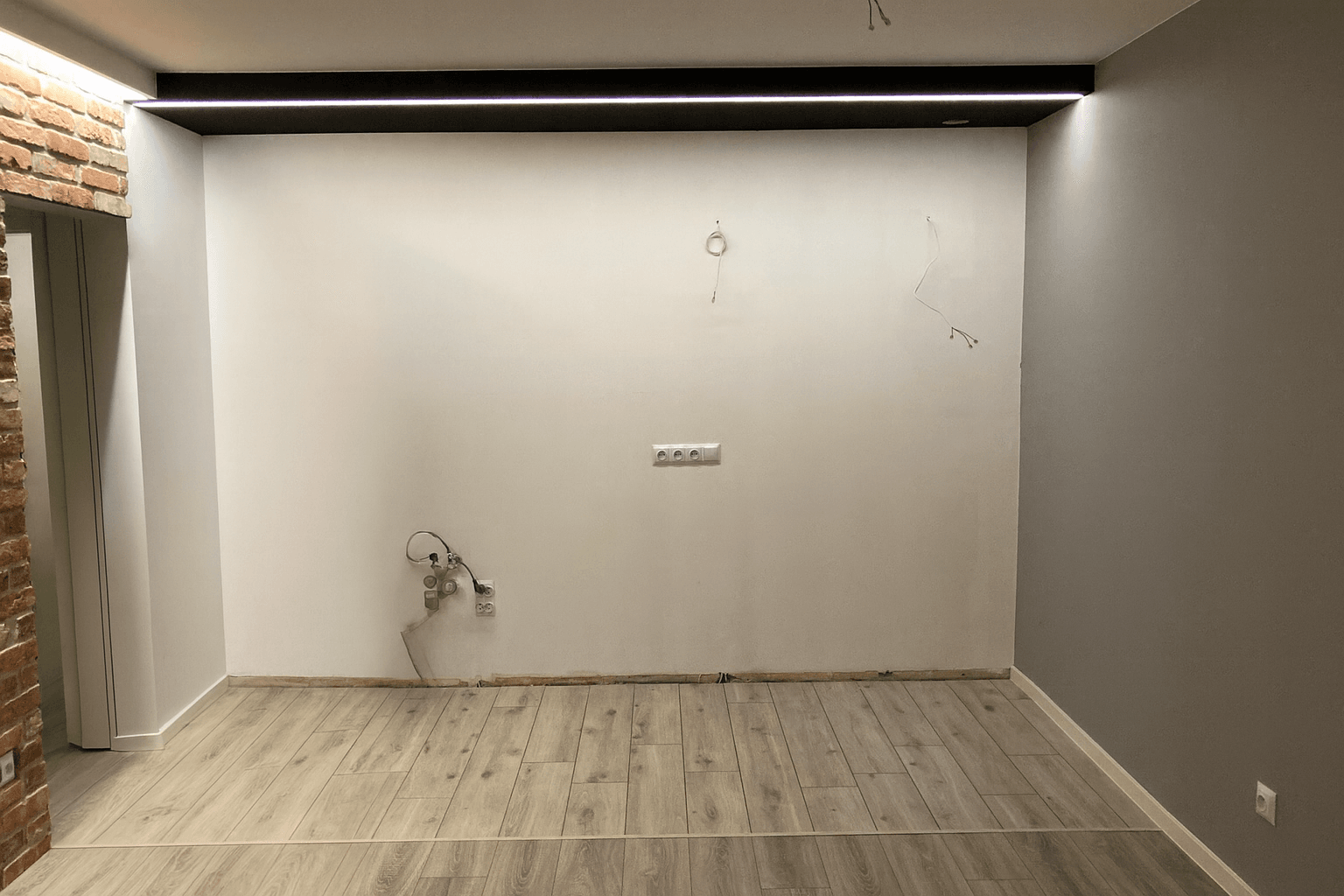 Zastaliśmy gołą ścianę z wyprowadzonymi mediami i instalacją pod okap. Instalacje były już przygotowane, ale sama przestrzeń nie pełniła jeszcze żadnej funkcji – brakowało mebli, blatów, sprzętu AGD i podziału stref w kuchni.